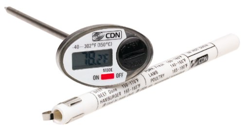 So simple to use - just push the button to turn this digital thermometer on, insert the 5-in. stainless steel probe into food and in no time an accurate reading appears to one-tenth of one degree, in either Fahrenheit or Celsius. The head is waterproof and repels steam, humidity and spills.Features:Waterproof, shatterproofFor thin cuts of meat, fish or poultryData-holdOne-button operationStainless steel housingExtra battery includedTemperature guide on sheathSheath can be used as handle extensionPocket clip