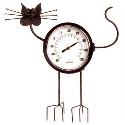 Durocraft DUOGA05005 Garden Thermometer Black finished metal construction with dial thermometer. Spiked “feet" allow this black cat to be firmly anchored in the ground. Features: -Black Cat Thermometer. -Material: aluminum. -Overall dimensions: 19.5" H x 17.3" W.