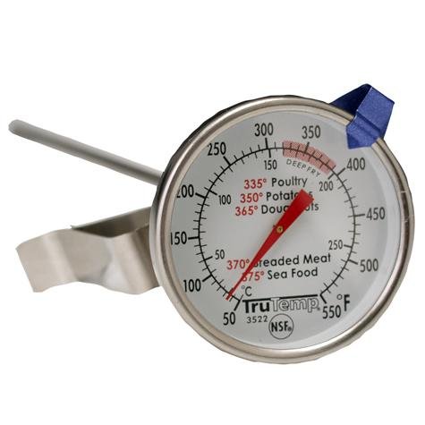 Features.Easy-to-read 2" dial. Range 50°F to 550°F and 50°C to 285°C. Common deep fry temperatures printed on dial. Red pointer. Adjustable temperature indicator. Stainless steel 12" stem with adjustable pan clip. NSF listed.