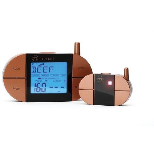 This digital cooking thermometer with two probes cooks meats according to your taste level - from rare to well done - without the guesswork. The clip-on receiver device lets you monitor your cooking from up to 120 feet away and will alert you when your meat is done cooking. Simply insert a probe into your meat and attach the probe to the base unit located outside the oven or barbecue; two probes allow two different types of meat (or two levels of doneness) to be monitored at the same time. Program the base unit with the type of meat and desired level of doneness; the large LCD readout displays the inner temperature of the food during cooking and an alarm sounds when the inner temperature is met. The base transits information to a remote unit, allowing the temperature to be monitored from inside the house or away from the kitchen.The thermometer is pre-programmed with 4 doneness settings and 10 meat settings.